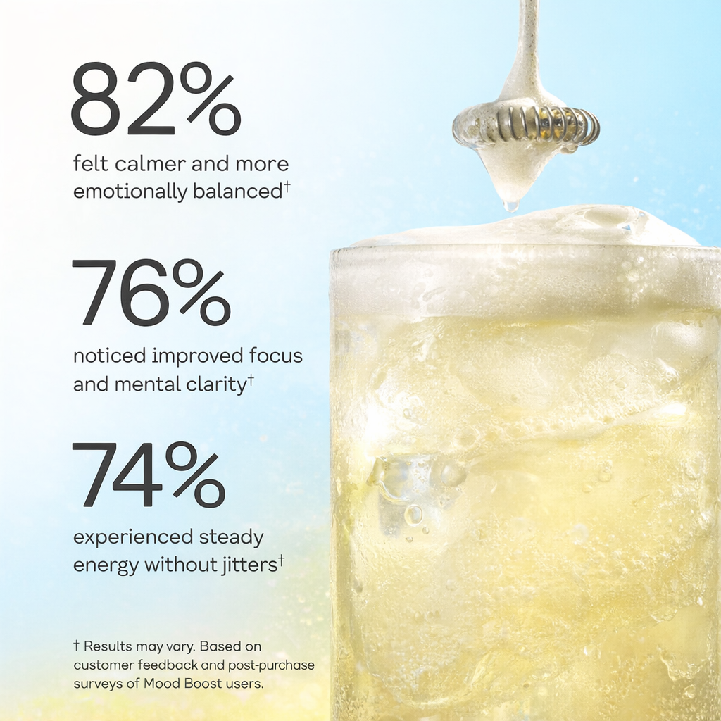 Mood Boost is crafted with a focused set of functional ingredients chosen for uplift, calm focus, and steady energy — with no caffeine, no sugar, and no mystery blends.